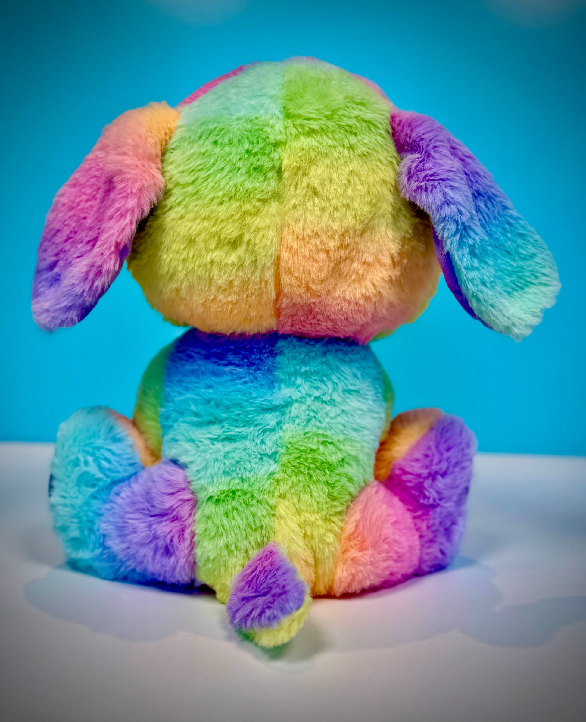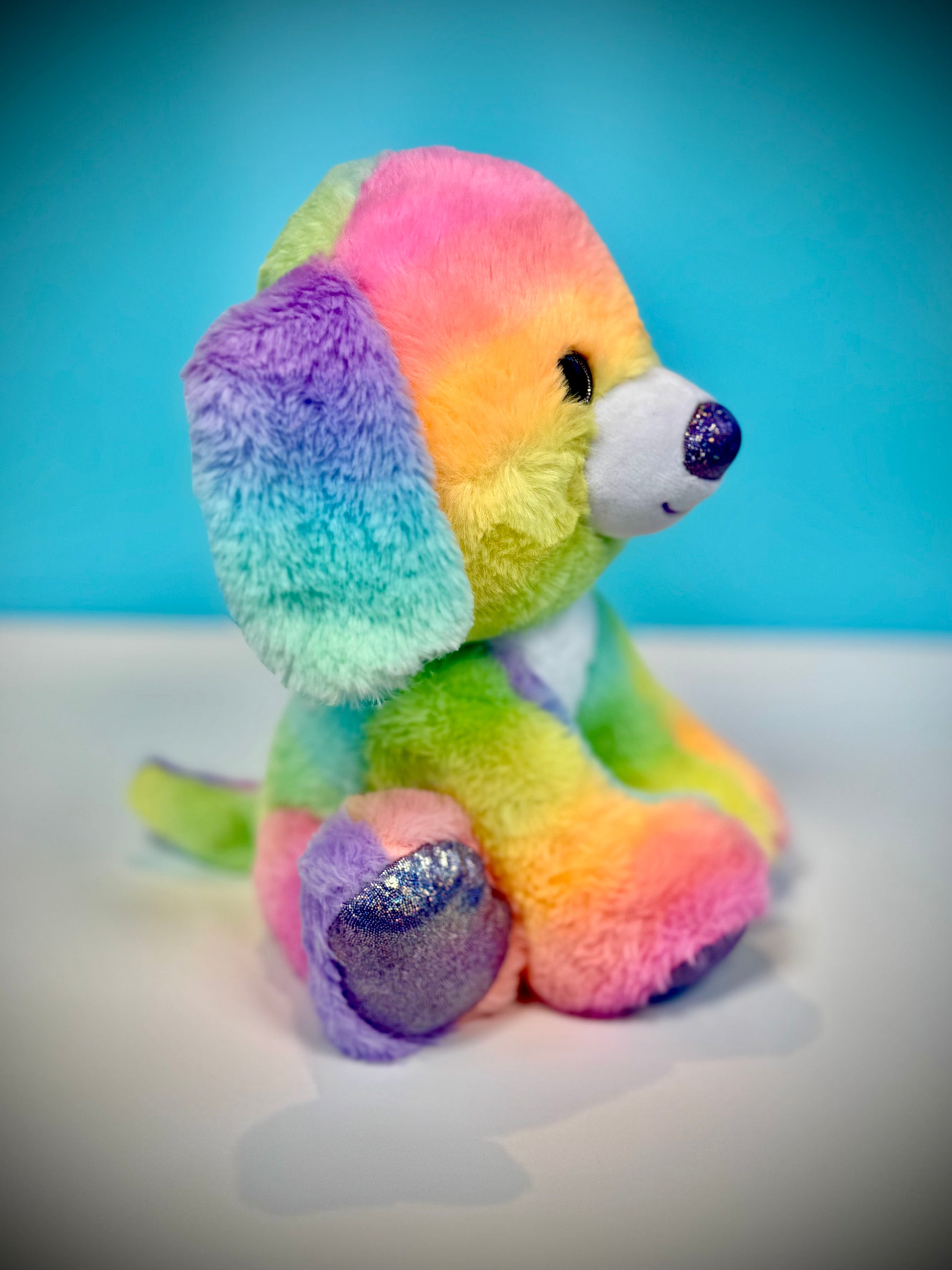 Snuggle up with Sparkles, our irresistibly soft plush puppy bursting with every vibrant color of the rainbow! This cuddly companion is perfect for little hands to hold and big imaginations to love. Sparkles brings joy, comfort, and a splash of colorful fun to bedtime, playtime, or anytime cuddles are needed! (10" tall from the sitting position)